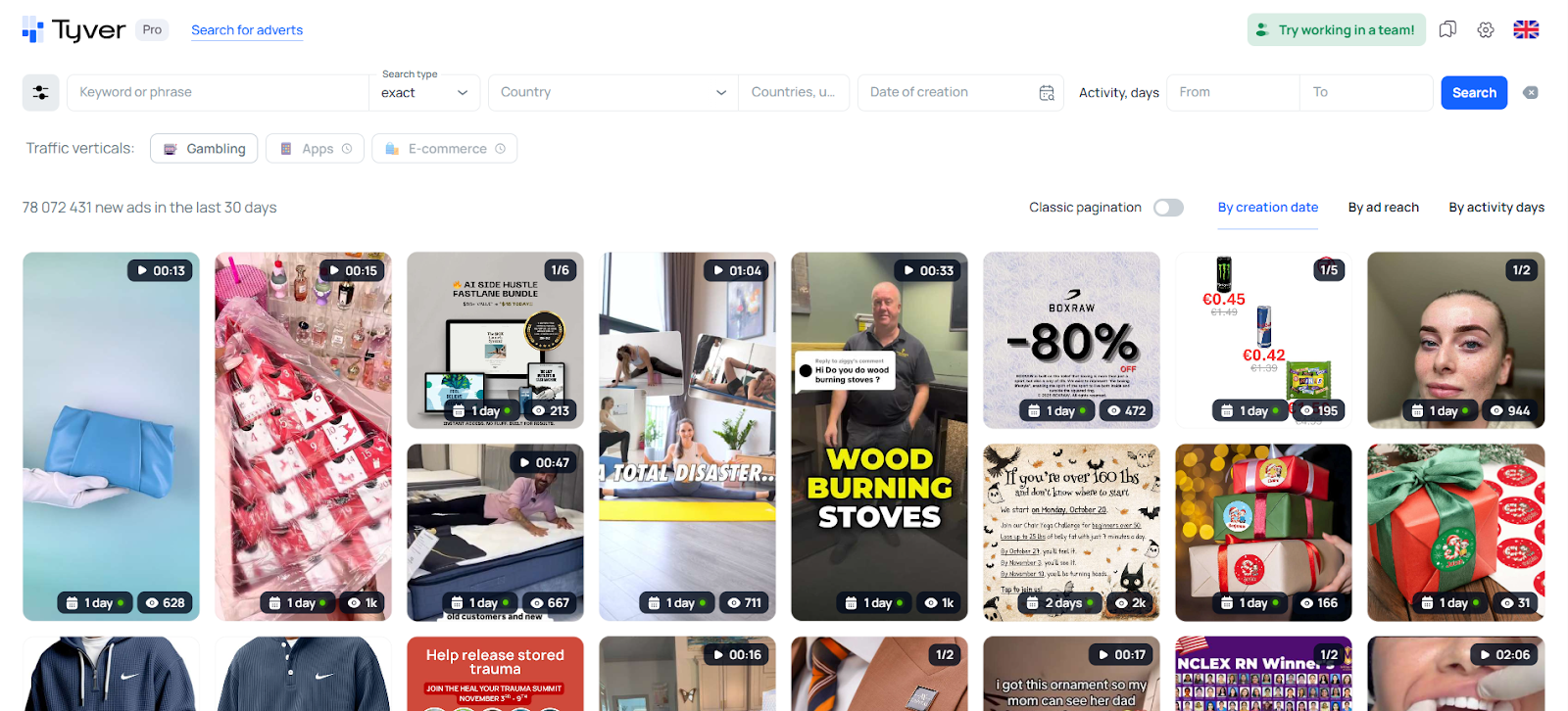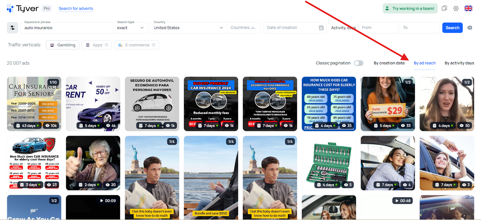 We also set targeting to the United States and won’t set any other filters. We will conduct spying using the Tyver spy tool. We immediately apply sorting by ad reach and days of activity. Sorting by views and duration of rotation is necessary to identify the most attention-grabbing and effective ads. Further keywords are best collected precisely from effective creatives.