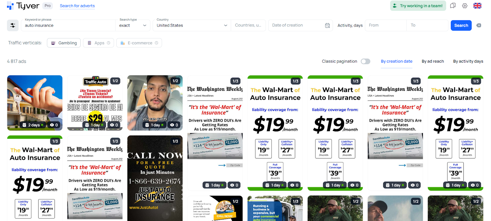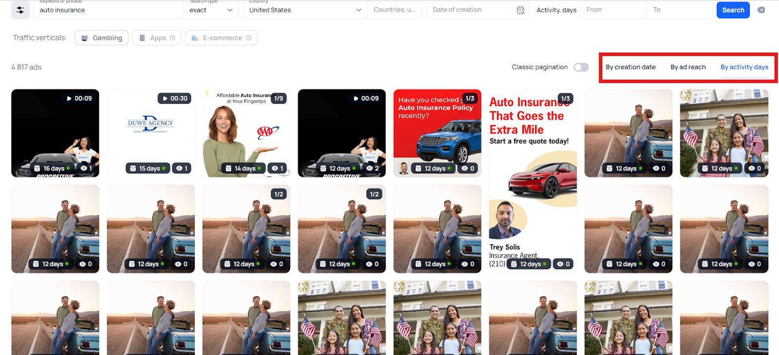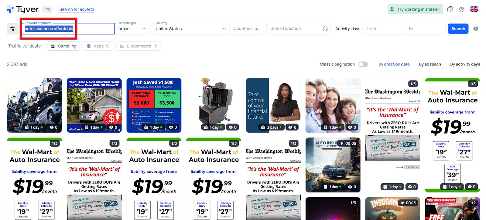 Spy services in the insurance space: how to search for creatives, filter the results, and select working ads?