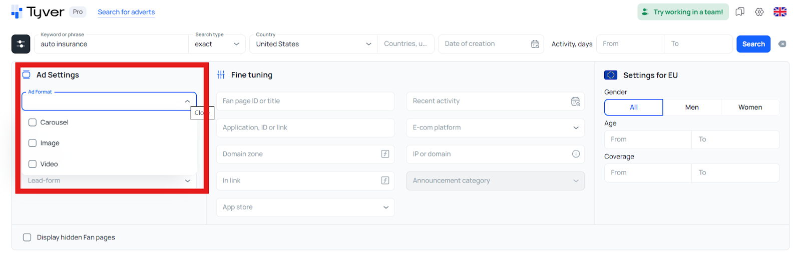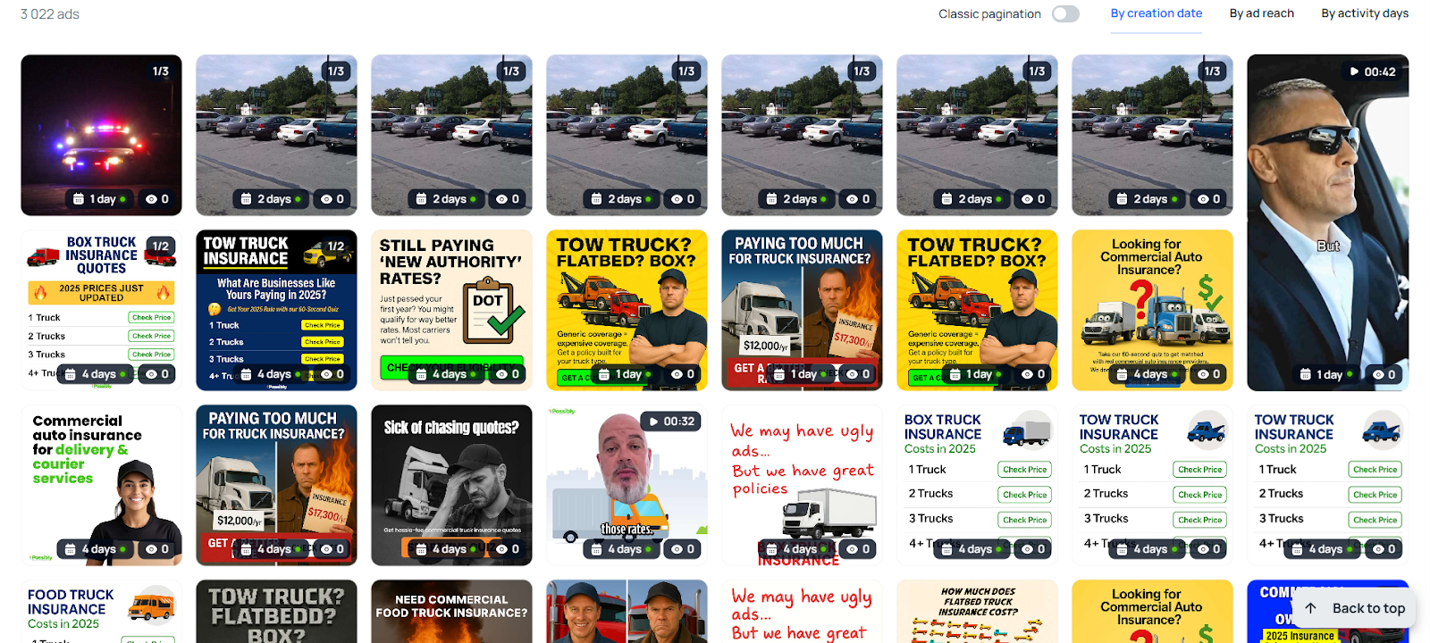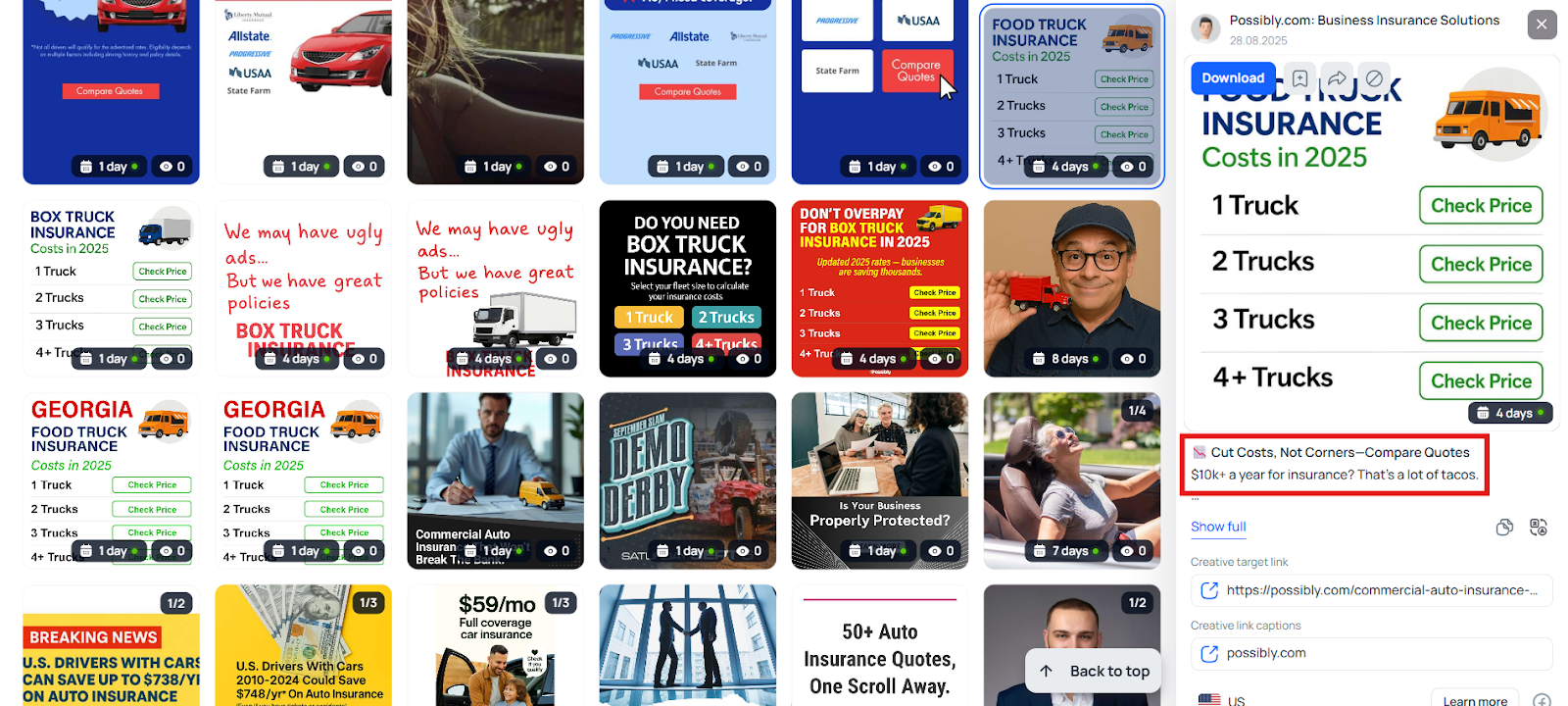 Spy services in the insurance space: how to search for creatives, filter the results, and select working ads?