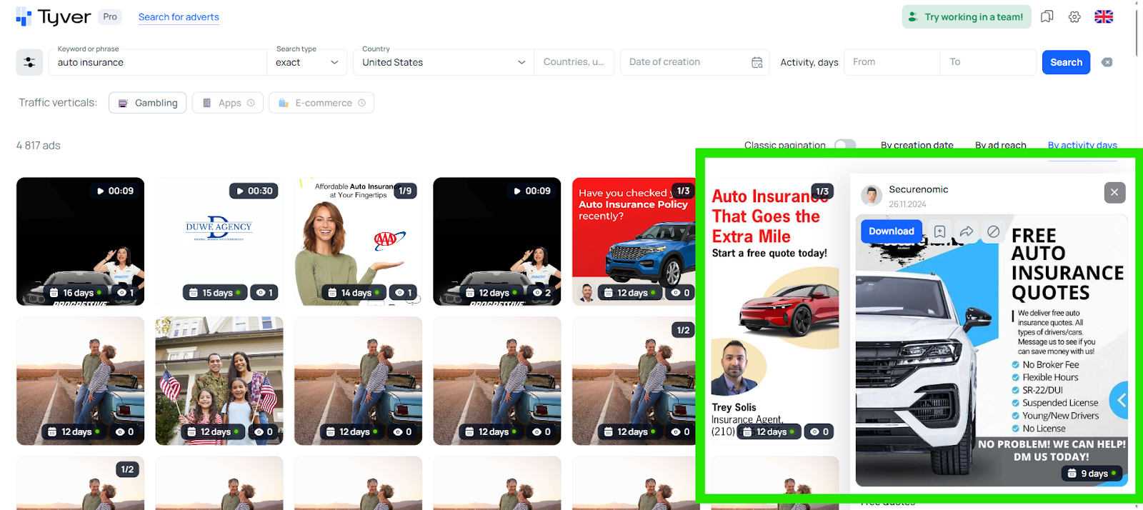 You can easily make ready-made images unique using the Download button and Paint — a basic but already sufficient toolkit for any creative maker. As for videos, there’s no need to worry either: even if your video-editing skills are minimal, Tyver still provides suitable source materials. The platform adds more than 2 million new creatives every day, and thousands of them are related to insurance in the United States alone.