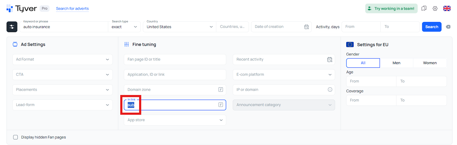 Let’s take a broad query like “auto insurance”, which often shows not only targeted ads but also news, stories, and blog posts. To leave only commercial advertisements, you should apply a filter by link identifiers — these are usually used to track ad performance.