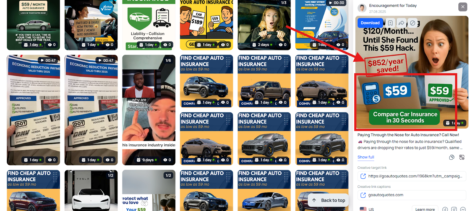 Advertising auto insurance is an expensive business — especially in such a GEO as the United States, where the cost of a thousand impressions and/or clicks simply cannot be low by default. The best way to avoid wasting money on obviously ineffective creatives and ad texts is to find those that are relevant and have already proven their effectiveness.